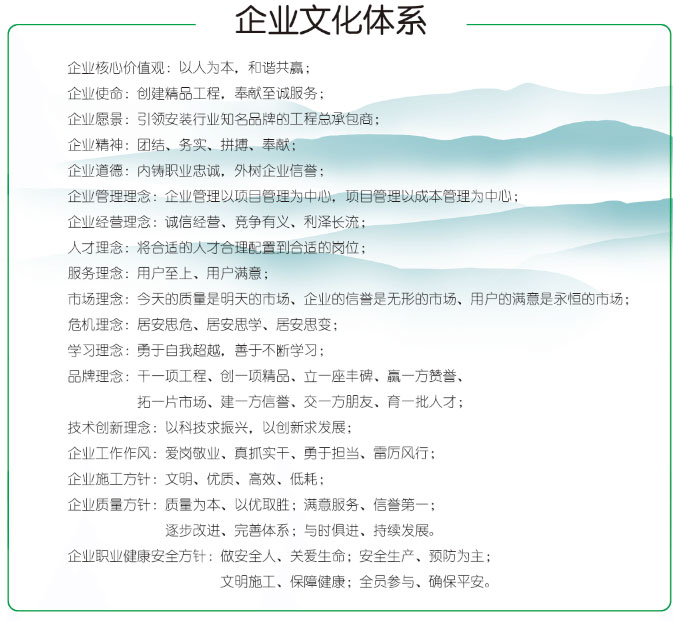 企业愿景:引领安装行业知名品牌的工程总承包商;